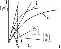 Якщо припустити, що за наявності в ланцюзі опору R струм змінювався б по лінійному закону з найбільшою швидкістю (пряма iL), то сталої величини I він досяг би за найменший час t = τ. Цей проміжок часу є важливою характеристикою і називається постійною часу електричного ланцюга. Постійну часу можна визначити графічно (рис.3.10), якщо провести дотичну Оа до кривої струму на початку координат і крапку а перетину дотичної з асимптотою спроектувати на вісь часу. Відрізок Оа' в масштабі часу і виразить постійну часу. Таку ж довжину має відрізок а'b', який можна одержати, якщо провести дотичну до кривої струму в будь-якій точці а1, знайти точку b перетину дотичної з асимптотою і спроектувати точки а1 і b на вісь часу. Аналітичний вираз постійної часу: τ = L/R, тобто постійна часу визначається лише параметрами R і L даного ланцюга. Вимушена і вільна складові перехідного струму Перехідний струм можна розглядати як алгебраїчну суму двох складових: . Перша складова є струмом, сталим в ланцюзі після закінчення перехідного процесу (пряма i пр на рис.3.10). Цей струм визначається безперервною дією постійної напруги U в перехідному і сталому режимах. Його називають вимушеним струмом. Друга складова виникає на початку перехідного процесу і поступово затухає до нуля, після чого перехідний процес вважається закінченим (крива iCB на рис.3.10). Ця складова перехідного струму називається вільним струмом. Із рівняння для вільної складової перехідного струму і в = Ie-t/τ виходить, що постійна часу електричного ланцюга рівна інтервалу часу, протягом якого вільний струм в цьому ланцюзі убуває в е раз. Вплив величини напруги і параметрів ланцюга на перехідний процес Перехідний процес при включенні ланцюга з R і L на постійну напругу U характеризують три показники: сталий струм, початкова швидкість зміни струму і постійна часу ланцюга; при цьому сталий струм і початкова швидкість зміни струму залежать від напруги, а постійна часу ланцюга, що характеризує тривалість перехідного процесу, від напруги не залежить (рис.3.11).