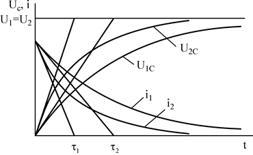 оскільки а вимушена складова відсутня: iпр = iу = 0. Вплив величини напруги джерела і параметрів ланцюга Перехідний процес при зарядці конденсатора від джерела постійної напруги характеризують три показники: стала напруга на конденсаторі, початкова швидкість зміни напруги, постійна часу; при зміні напруги джерела змінюються стала напруга на конденсаторі і початкова швидкість зміни напруги, а постійна часу ланцюга від напруги не залежить. На рис.3.13 приведені (відповідно двом різним напругам джерела U1 і U2 ) графіки зміни напруги на конденсаторі.