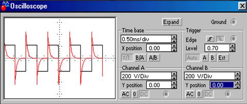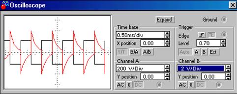 Рис. 3.17 - Приклад осцилограми RC -ланцюга 5. Перевести ключ К4 у верхнє (за схемою) положення, що дає можливість спостерігати осцилограми напруги на конденсаторі С1 досліджуваного ланцюга. Включити схему і, дочекавшись появи зображення на екрані віртуального осцилографа, замалювати осцилограми вхідної напруги і напруги на конденсаторі С1. Визначити параметри змальованих сигналів (амплітуду, тривалість, період). За осцилограмами визначити тривалість перехідного процесу у досліджуваному ланцюзі і розрахувати постійну часу досліджуваного ланцюга. Приклад осцилограми приведено на рис. 3.18.