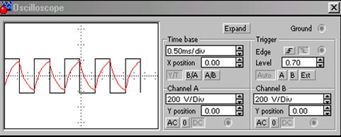 Рис. 3.18 - Приклад осцилограми напруги на конденсаторі С1 6. Для дослідження RL -ланцюга встановити ключ К2 у положення, що забезпечує це дослідження, а ключ К4 - у нижнє (за схемою) положення, яке забезпечує вимір струмів схеми. Включити схему і, дочекавшись появи зображення на екрані віртуального осцилографа, замалювати осцилограми вхідної напруги і струму котушки. Визначити параметри змальованих сигналів (амплітуду, тривалість, період). За осцилограмами визначити тривалість перехідного процесу у досліджуваному ланцюзі і розрахувати постійну часу досліджуваного ланцюга. Приклад осцилограми приведено на рис. 3.19.