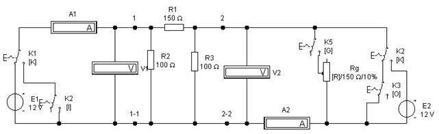 6. Підключити джерело Е2 до вихідних клем чотириполюсника натисненням на клавіатурі клавіші «К». Для забезпечення режиму холостого ходу на вході чотириполюсника встановити ключ К2 у розімкнене положення (натисненням на клавіатурі клавіші «I»). Включити схему і, дочекавшись стабільних показань вимірювальних приладів, записати їх у таблицю 6.1. 7. Для забезпечення режиму «короткого замикання на вході» чотириполюсника встановити ключ К2 у замкнуте положення. Включити схему і, дочекавшись стабільних показань вимірювальних приладів, записати їх у таблицю 6.1. 8. За заданою схемою і у відповідності до знайдених характеристик розрахувати значення опорів Z11x, Z11K, Z21x, Z22K та характеристичний опір Zс. 9. Для дослідження впливу опору навантаження на вхідні і вихідні струми чотириполюсника підключити джерело Е1 до вхідних клем чотириполюсника (за допомогою ключа К1). Підключити також до вихідних клем опір навантаження Rg (ключ К3 розімкнути, ключ К5 замкнути). Встановити величину опору Rg на рівні 10відсотків номіналу. Включити схему і, дочекавшись стабільних показань вимірювальних приладів, записати їх показання у таблицю 6.2. 10. Довести послідовно величину опору Rg до номінального значення (з кроком 10%) і записати показання вимірювальних приладів у таблицю 6.2. Для зміни величини опору резистора Rg натиснути на клавіатурі комп'ютера клавіші Shift+R (збільшення) або клавішу R (зменшення). Виключити схему. Таблиця 6.2 – Результати досліджень режиму навантаження