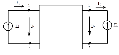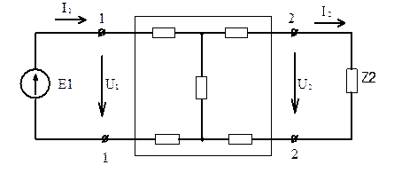 Рисунок 6.2 – Принципова схема підключення чотириполюсника Частина електричного ланцюга, що має дві пари затискачів (полюсів), одна з яких є вхідною, а інша - вихідною, називається чотириполюсником. Внутрішні схеми чотириполюсників можуть бути різноманітні. Режим роботи чотириполюсника щодо гілок, які приєднуються до цих пар полюсів, цілком визначений, якщо відомі напруги і струми на вході і виході: U1, U2, I1, I2. У режимі чотириполюсника нічого не зміниться, якщо замість приймача Z2 до вторинних затискачів приєднати джерело Е.Р.С. Е2 = - U2 (рис. 6.3).