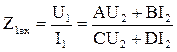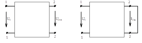 Рисунок 6.4 – Режими холостого ходу і короткого замикання чотириполюсника З рівнянь чотириполюсника «системи А» виходить: U1хх = AU2хх; I1хх = CU2хх; U1кз = BI2кз; I1кз = DI2кз, звідки коефіцієнти чотириполюсника: А = U1хх / U2хх; B = U1кз / I2кз; C = I1хх; D = I1кз / I2кз. З досліду холостого ходу можна також знайти вхідний опір при розімкнених вторинних затискачах: U1хх / I1хх = Z1хх = A / C, а з досліду короткого замикання - вхідний опір при замкнутих накоротко вторинних затискачах: U1кз / I1кз = Z1кз = B / D. Якщо відомі внутрішня схема і опори всіх гілок пасивного чотириполюсника, то параметри його можна розрахувати, застосовуючи відомі методи перетворення схем. Спочатку визначають вхідні опори Z1хх і Z1кз і додатково – вхідний опір з боку вторинних затисків при розімкнених первинних затисках при I1 = 0: Z2хх = U2хх / I2хх = D / C. Вхідний опір з боку вторинних затисків при короткому замиканні на первинній стороні при U1 = 0: U2КЗ / I2КЗ = Z2КЗ = B / A. Напруга і струм на вході чотириполюсника у робочому режимі (режимі навантаження) с кладаються з двох доданків: U1 = AU2 + BI2 = U1хх + U1кз, I1 = CU2 + DI2 = I1хх + I1кз.. Робочий режим чотириполюсника можна характеризувати також вхідним опором з боку первинних затисків Z1вх, якщо взяти відношення рівнянь останньої системи (і врахувати, що U2 = I2Z2):