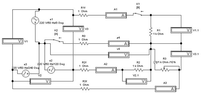 7.4 Порядок виконання роботи: 1. Зібрати в програмі Electronics Workbench електричну схему відповідно до рис. 7.1. Вольтметри V1…V3 призначені для вимірювання лінійних напруг джерела трифазної напруги, вольтметри V1.1…V3.1 призначені для вимірювання фазних напруг приймача трифазної напруги; вольтметр V4 вимірює падіння напруги на нульовому провіднику схеми. Амперметри А1…А3 призначені для вимірювання лінійних струмів джерела трифазної напруги; амперметр А4 вимірює струм в нульовому провіднику схеми.. Резистори R1f…R3f, R0 імітують лінію зв'язку джерела з приймачем, а резистори R1…R3 – приймач. 2. Для дослідження симетричного трифазного приймача встановити значення резистора R3 рівним номінальному (1кОм). Для зміни величини опору резистора натиснути на клавіатурі комп'ютера клавішу R (зменшення) або Shift+R (збільшення). Ключі К1 і К2 замкнуті (зміна стану ключів реалізується натисканням на клавіатурі, відповідно, клавіші В чи А. 3. Включити схему за допомогою перемикача 4. За результатами вимірювань побудувати векторні діаграми струмів і напруг. таблиця 7.1 Результати дослідження симетричного трифазного приймача