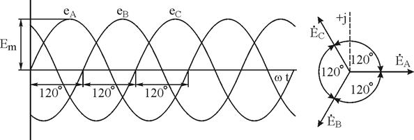 Рисунок 7.3 – Графіки і векторна діаграма симетричної системи е.р.с. Незв'язана та зв'язана трифазні системи електричних кіл Якщо кожну обмотку трифазного генератора з'єднати з своїм приймачем, утворюються три незалежні кола (три фази) (рис. 7.4, а). Якщо у трифазному колі діє симетрична система Е.Р.С, то, при однакових комплексних опорах фаз струми у фазах також утворюють симетричну систему (будуть рівними за величиною і зсунуті по фазі на кут 120°, рис.7.4, б). У незв'язаній трифазній системі генератор з приймачем енергії з'єднується шістьма провідниками; внаслідок великої кількості сполучних провідників такі системи практично не застосовуються. Скорочення числа сполучних провідників досягається у зв'язаних системах, де обмотки генератора, як і окремі фази приймача, електрично зв'язані між собою і утворюють трифазні кола. У техніці та на виробництві