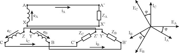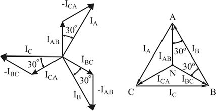 При симетричному навантаженні струми у всіх фазах однакові. «Зірка» векторів лінійних струмів зсунута щодо «зірки» фазних струмів на 30° проти обертання векторів (при прямій послідовності фаз, рис. 8.5, а).