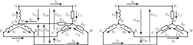 Рисунок 7.5 – Зв'язані трифазні системи електричних ланцюгів при сполученні зіркою При такому з’єднанні кінці обмоток джерела X, Y, Z з'єднуються в загальну точку N, т.зв. нульову точку або нейтраль. У випадку зв'язаної чотирипровідної системи нульові точки джерела енергії і приймача сполучаються провідником, який називається нульовим або нейтральним (рис.7.5, а). У випадку зв'язаної трипровідної системи, яка реалізується при симетричній системі Е.Р.С. та струмів, струм у нульовому провіднику відсутній за визначенням і у наявності самого провідника немає потреби (рис. 7.4, б). Фазні та лінійні напруги Різниця потенціалів між лінійними затискачем і нейтраллю, тобто між початком і кінцем фази, визначає фазну напругу (UA, UB, UС) яка відрізняється від Е.Р.С. на величину падіння напруги у відповідній обмотці. Якщо опором обмоток можна нехтувати, то фазні напруги джерела співпадають за величиною із Е.Р.С. (рис. 7.6, а). Різниця потенціалів між кожною парою лінійних дротів називається лінійною напругою (