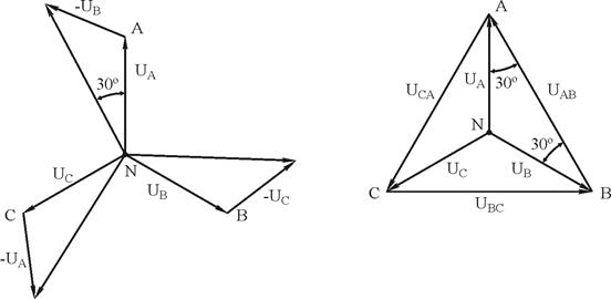 а) б) Рисунок 7.6 – Векторні діаграми напруг при сполученні обмоток джерела «зіркою» З діаграми рисунка 7.6, б можна одержати співвідношення між лінійними і фазними напругами для симетричної системи: