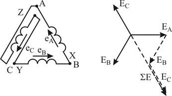 У цьому випадку при холостому ході джерела струм в його обмотках відсутній. При несиметрії системи Е.Р.С. їх сума не рівна нулю, тому вже при холостому ході в обмотках джерела утворюється струм, який може бути значним, оскільки опір обмоток за визначенням малий. При неправильному включенні обмоток, коли дві сусідні фази сполучені початками або кінцями (рис. 8.3), сума Е.Р.С. в контурі дорівнює подвоєній величині Е.Р.С. фази.
