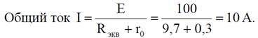 I=I1=I2=I3-9; U1 = I·R1 = 10·3 = 30B. U2 = I·R2 = 10·4, 7 = 47B. U3-9 = I • R3-9 = 10 • 2 = 20 B, U3-9 = U3 = U4-9; Напряжение на зажимах источника U = I • RэKB или U = U1 + U2 + U3-9 = 30 + 47 + 20 = 97 В или U = E-I·r0;