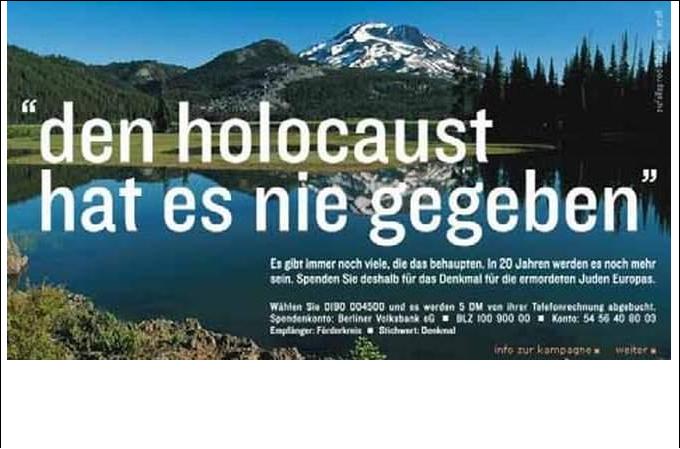 «До сих пор многие утверждают подобное. Через 20 лет таких людей станет ещё больше. Поэтому жертвуйте на мемориал для евреев, убиённых в Европе»