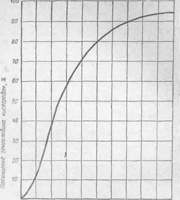 0 10 20 30 40 50 60 70 80 90 100 Парциальное давление кислорода мм. pm.cm. Рис. 2. в момент протекания венозной крови к легким по окончании цикла кровообращения всего 40 мм рт. ст. Таким образом, между венозной я артериальной кровью существует значительный перепад давления, равный 100—40=60 мм рт. ст. Между углекислотой, вдыхаемой с воздухом (парциальное давление 40 мм рт. ст.), и углекислотой, притекающей с венозной кровью к легким по окончании цикла кровообращения (парциальное давление 47—50 мм рт: ст.), перепад давления составляет 7—10 мм рт. ст. В результате существующего перепада давлений кислород переходит из легочных альвеол в кровь, а непосредственно в тканях организма этот кислород из крови диффундирует в клетки (в среду с еще более низким парциальным давлением). Углекислота, наоборот, сначала из тканей переходит в кровь, а затем, при подходе венозной крови к легким, — из крови в альвеолы легкого, откуда она и выдыхается в окружающий воздух (рис. 3).