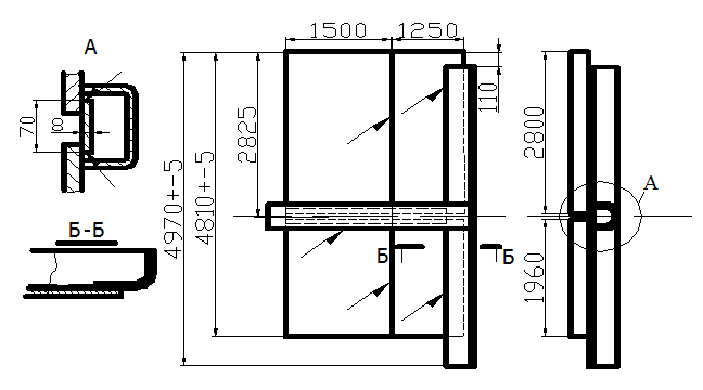 Технические условия 1.Химический состав стали по ГОСТ 19281-89, сортамент уголков стальных гнутых по ГОСТ 19771-74, швеллеров – по ГОСТ 8278-83. Сортамент листового проката по ГОСТ 19903-74, технические условия на прокат листовой по ГОСТ 19281-89. Накладка по ГОСТ 103-76. 2. Полустенок является частью боковой стены бронированного цельнометаллического вагона, предназначенного для перевозки взрывчатых веществ 3. Смещение кромок листов стыковых швов не должны превышать 1.0 мм. 4. Подрезы, наплывы, брызги металла и другие поверхностные дефекты швов не допускаются. 5. Трещины в швах не допускаются. Допускаются одиночные поры и неметаллические включения, но не более 3 дефектов на одном погоном метре