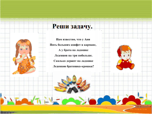 Математика 1 класс Дата: 06.04.2015 Составление и решение задач на одно действие Устный счет - Самое маленькое однозначное число; А что такое однозначное число? - Самое большое однозначное число; - Самое маленькое двузначное число; А что такое двузначное число? А как по-другому можно назвать это число? - Самое большое двузначное число; - Самое большое двузначное круглое число; - Число, предшествующее числу 5; 6; 9; 2; 10; - Число, следующее за числом 2; 7; 9; 1; 4; - Соседи числа 4; 8; 6; 1; 3; Решение примеров и задач Повторение правила нахождения неизвестного вычитаемого