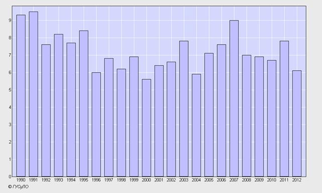 Рис. 1 Рівень шлюбності в перерахунку на тисячу населення з 1990 по 2012 рр., за даними Держкомстату і перепису населення 2001 р. Незначний спад продовжувався до 2011 р. і перервався різким зрозстанням в цьому ж році (Рис.1) Так, у Тернопільській області у 1990 р. було зареєстровано 8, 6 шлюбів на 1000 осіб, а в 2003 р. – 8, 0; з них у міських поселеннях цей показник у 2003 р. складав 9, 8 шлюбів на 1000 осіб, а у сільській місцевості – 6, 6. Варто зазначити, що зменшення показників шлюбності в області за останні 13 років відбулося саме у сільській місцевості (з 7, 9 шлюбів на 1000 осіб у 1990 р. до 6, 6 шлюбів у 2003 р.), що пов'язане із низькою народжуваністю та значними механічним відтоком молодих людей з сіл. Щодо розлучень, то по області цей показник складає 3, 2 ‰ у 2003 р., що майже у два рази більше, ніж у 1990 р. (1, 8 ‰). І знову ж таки ця негативна тенденція чіткіше прослідковується саме у сільській місцевості (від 0, 9 розлучень на 1000 осіб у 1990 р. до 2, 3 у 2003 р.), тоді як у містах ці показники складали відповідно 3, 1 та 4, 4 ‰. Рівень повторних шлюбів не відповідає рівневі розлучень, а повторні шлюби виявились ще більшою мірою нестійкими, ніж перші. Водночас переважання сім'ї з двома батьками, заснованої на офіційному шлюбі, дедалі більше поступається місцем однобатьківським сім'ям, очолюваним здебільшого жінками. У неповних сім'ях виникає проблема " важких” дітей і підлітків, в результаті чого знижується рівень народжуваності. В результаті значно скоротився контингент подружніх пар, які мають оптимальні умови для народження дітей, що створює стабільний та тривалий шлюб у нашому суспільстві.