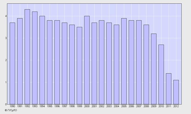 Рис. 2 Рівень розлучуваності в перерахунку на тисячу населення з 1990 по 2012 рр., за даними Держкомстату і перепису населення 2001 р.