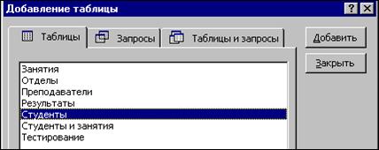 Вікно „ Добавление таблицы ”складається з трьох вкладок, що містять перелік об'єктів, запропонованих програмою для проектування запиту: „ Таблицы ”, „ Запросы ”і „ Таблицы и запросы ”. При виборі вкладки „ Таблицы ”необхідно виділити потрібну таблицю із запропонованого списку і за допомогою кнопки „ Добавить ”можна додати декілька таблиць. Наприклад, на рис.3.2 вибрана таблиця „ Студенти ”. Імена таблиць повинні бути представлені у вікні конструктора запиту (рис 3.3).