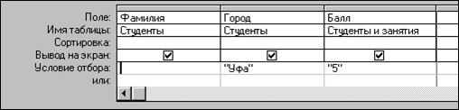 При такій умові запису, також будуть обрані прізвища студентів з оцінками по іспитам 4 або 5. 5.3.2. Логічна операція и Логічна операція и (and) використовується в тому випадку, коли потрібно виконання двох умов одночасно, і тільки в цьому випадку запис буде обраний. Наприклад, записавши умову > 2 and < 5 будуть вибрані тільки оцінки „3” і „4”. Щоб об'єднати декілька умов відбору оператором и (and), потрібно записати їх в одному рядку. Наприклад, на рис 3.5 показано як можна задати умову для вибору прізвищ студентів, що проживають в місті Уфа, і які вчаться тільки на „5”.