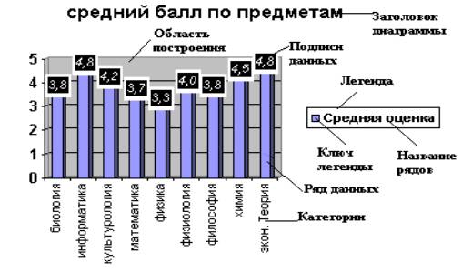 5.7.1. Елементи діаграм і підготовка початкових даних Початковими даними для побудови діаграм можуть бути дані таблиць або запитів. Реальні таблиці в базах даних містять величезну кількість записів. Якщо при побудові діаграми не обмежити кількість відображуваних у ній даних, то вона, зазвичай, буде насичена зайвими деталями. Тому частіше усього, діаграми будують по результатам запитів до бази даних. Зручніше для побудови діаграм використовувати підсумкові або перехресні запити. Наприклад, можна побудувати діаграму по результату підсумкового запиту, що підраховує середній бал кожного студента за минулу сесію. Основні елементи діаграм Microsoft Access показані на рис. 6.5.