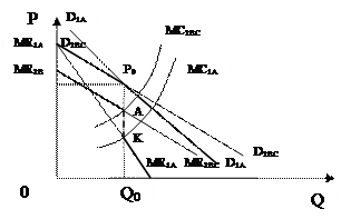 Разберём данную модель на примере. Предположим, что на рынке функционирую несколько фирм: (А) и её конкуренты (В и С). На рынке существуют две линии спроса (D1A) и (D2BC), которые соответственно имеют кривые предельного дохода: (MR1A и MR2BC). Первая линия спроса (D1A) более эластична, чем (D2BC). Она предполагает, что при изменении цены фирмой (А) от максимизирующего прибыль состояния (Р0) вверх, её конкуренты (В и С) не последуют за ней и останутся на своей линии спроса (D2BC), что соответствует отрезку (D2BCР0). Если же фирма (А) снизит цены, то конкуренты последуют за ней – отрезок (Р0D1A). В результате образуется общая кривая спроса олигополии (D2BCР0D1A), которая имеет ломаный вид. Данной ломаной кривой спроса олигополии соответствует ломаная кривая предельного дохода (MR2BCАКМR1A), которая имеет разрыв (АК), образующийся в результате различной эластичности и наклона отрезков (D2BCР0) и (Р0D1A) выше и ниже текущей цены (Р0) соответствующих кривых спроса (D1A) и (D2BC). Этот анализ показывает, что любое изменение в цене в олигополистических отраслях приводит к негативным последствиям. Для олигополии характерна определённая «жёсткость» цен. Действительно, издержки олигополиста могут изменяться, допустим, так как в нашем примере уровне при одинаковом объёме (Q0).