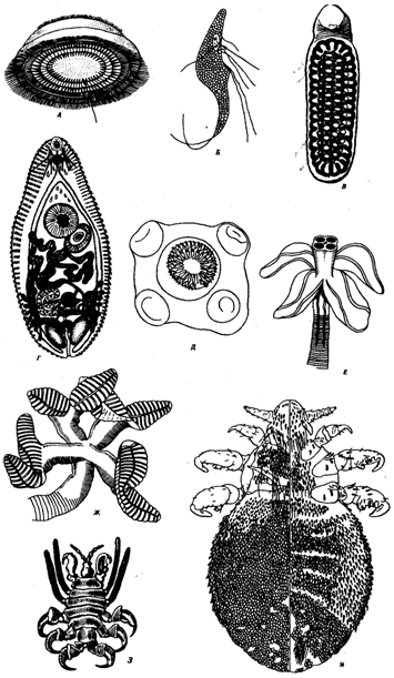 Рис. 18.4. Органы прикрепления паразитов Присасывательные диски у инфузории (Л) и лямблии (Б) (указаны стрелками), сложная присоска (В) и кутикулярные шипики на коже (Г) у сосальщиков, крючья и сложные присоски на головках ленточных червей (Д, Е, Ж), конечности, служащие для прикрепления, у ракообразного (3) и насекомого (И) Некоторые паразиты из типа простейших приобретают способность к множественному делению — шизогонии, когда из одного паразита может образоваться более 1000 дочерних особей, или к спорогонии, в результате которой из одной особи могут образоваться десятки тысяч организмов следующего поколения. Практически у всех эктопаразитов и паразитов, обитающих в полостных органах, имеются адаптации для прикрепления к телу хозяина. Они встречаются у простейших (присасывательные диски лямблии), у гельминтов (присоски, шипики, крючья плоских червей, хитинизированный ротовой аппарат ряда круглых червей) и паразитических членистоногих (своеобразные конечности) (рис. 18.4). Эндопаразиты, обитающие в полостных органах, имеют покровы, обладающие антиферментными свойствами, быстро регенерирующие либо вообще непроницаемые для ферментов хозяина. Паразиты, живущие в тканях, часто там инкапсулируются (рис. 18.5).