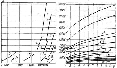 Для вибору фільтру скористаємося номограмою [6, стор.210]: 1. На осі ординат знаходимо точку 1, що відповідає втраті газу через фільтр 4656 2. Точка 2 розташована між кривими 8 і 9, що визначають характеристики фільтру, а саме його діаметр і відсоток його завантаження. В нашому випадку це фільтр ФГ-100-6, з відсотком завантаження 50 %. 3. Тепер від точки 1 проводимо горизонталь в ліво до точки 3, яка розташовується між кривими 8 і 9 графіку, ближче до 9-ої. 4. Опускаємо лінію на вісь абсцис. Отримуємо значення втрат в фільтрі: