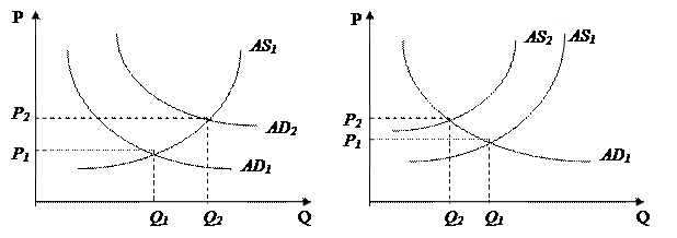 Инфляция – увеличение количества денег, необходимых для обращения товаров, сверх реальных потребностей экономики и их обесценение. Инфляция – это макроэкономический процесс, охватывающий всю экономику страны, т.е. затрагивающий общий уровень цен. Это не означает, что в равной мере повышаются цены на все без исключения товары и услуги: на некоторые товары цены могут остаться прежними и даже понизиться. К тому же рост цен на отдельные группы товаров неодинаков, различен, поэтому и последствия для разных слоев населения также различны. По вопросу причин инфляции у экономистов нет единого подхода к ее объяснению. Сначала считали такой причиной повсеместный переход к бумажным деньгам. Однако инфляция не исчезла и после того, как эмиссия денег во многих странах была взята под строгий контроль. Стало понятно, что инфляция порождается не одной, а комплексом причин. Кейнс и его сторонники объясняют наступление инфляции избыточным (чрезмерным) спросом в условиях полной занятости. Неоклассики, напротив, считают, что в основе инфляции лежит рост издержек производства, а следовательно, сокращение предложения товаров, что приводит к инфляции. Таким образом, различают два типа инфляции: инфляцию спроса и инфляцию предложения (или инфляцию издержек). Инфляция спроса возникает тогда, когда совокупный спрос оказывается больше суммарного предложения товаров и услуг, несмотря на то, что производство работает на полную мощность и все ресурсы задействованы полностью. Поэтому оно не может произвести дополнительное количество продукции, чтобы удовлетворить повышенный спрос, и как неизбежное следствие такого положения – рост цен, в результате которого устанавливается новое равновесие цен на их более высоком уровне (рис. 2). Говоря иначе, инфляция спроса имеет место там, где «большое количество денег гоняется за небольшим количеством товаров». Инфляция может быть вызвана и со стороны предложения за счет его уменьшения. Причиной этого может быть рост издержек производства на единицу продукции. Это происходит тогда, когда повышаются затраты на важнейшие производственные ресурсы (например, на энергетическое сырье, зерно, заработную плату и т.д.). Увеличение таких издержек при существующем уровне цен сокращает прибыль на единицу продукции. В результате этого сокращается предложение товаров при неизменившемся спросе и общий уровень цен повышается (рис. 3).