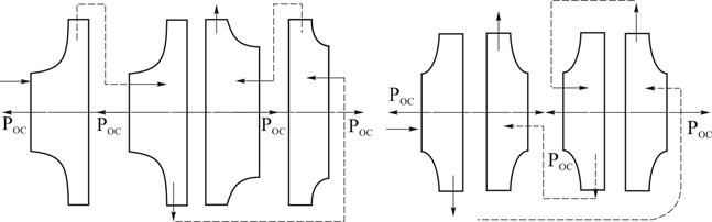 4. Уравновешивание осевой силы достигается взаимно-противоположным расположением рабочих колес (рисунок 3.9 а, в), т.к. осевая сила по величине одинакова на всех ступенях.