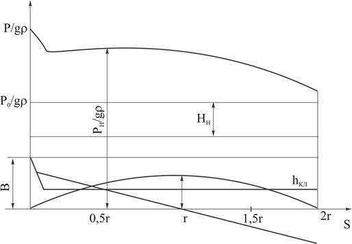 По данным в таблице 6.2 построим зависимости составляющих напора всасывания от длины хода поршня (S=2r), а затем сложив ординаты слагаемых получим график изменения напора всасывания по длине хода поршня, как это показано на рисунке 6.19. Из графика видно, что процесс всасываний происходит при переменном напоре