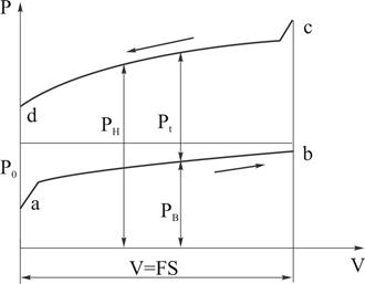 Совместим графики напоров всасывания (рисунок 6.19) и нагнетания (рисунок 6.20) и представим их в координатах р-V, где объем рабочей камеры V пропорционален длине хода поршня (V=FS). В результате получаем замкнутую диаграмму, которая представляет собой зависимость давления в цилиндре в процессе всасывания и нагнетания.