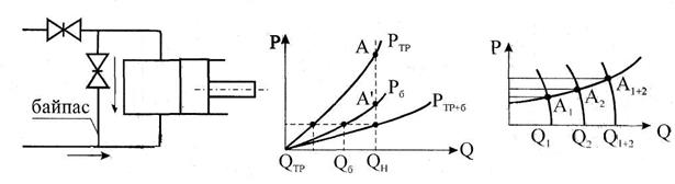 На графике представлены характеристики трубопровода ртр байпаса рБ; при их совместной работе рТР + рБ. На пересечении с характеристикой насоса получаем на характеристике трубопровода рабочую точку А, а на характеристике рТР+рБ.+А', когда подача насоса распределяется между трубопроводом и байпасом: