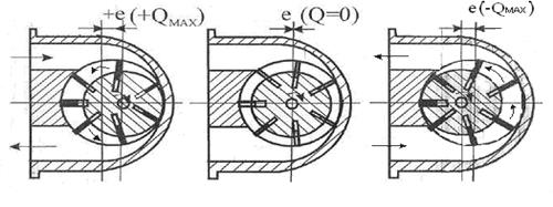 где D -диаметр корпуса; е- эксцентритет (расстояние между центрами ротора и корпуса); Изменяя эксцентритет, можно регулировать подачу насоса На рисунке 7.6 показаны положения ротора многопластинчатого насоса при разных эксцентритетах.