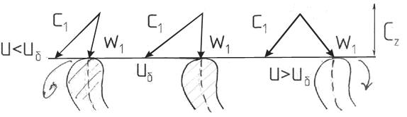 8.5 Число оборотов ротора турбины Параллелограмм скоростей на входе и выходе из ротора имеют общие скорости U и Cz. Совмещенные треугольники скоростей называются полигоном скоростей. Для безударного режима полигон имеет вид, показанный на рисунке 8-11.