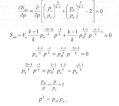 Чтобы определить при каком значении р адиабатическое работа будет наименьшей, возьмем первую производную Saд no p и приравняем нулю: