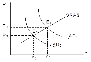 Государство хочет сократить безработицу путем стимулирования совокупного спроса, что ведет к сдвигу кривой AD вправо в положение AD1. В коротком периоде равновесие устанавливается в т. Е1, что означает рост ВВП, сопровождающийся повышением цен. Рост ВВП при заданной производственной функции означает повышение занятости, следовательно – сокращение безработицы. Иными словами, сокращение безработицы сочетается с инфляцией. Современная трактовка кривой Филлипса утверждает, что рост цен зависит от: - ожидаемой инфляции; - отклонения безработицы от ее естественного уровня, т.е. от циклической безработицы; - шоков предложения (изменения цен на топливно-энергетические ресурсы, изменения государством минимальной заработной платы, введение государственного контроля над ценами и т.п.). Это можно выразить уравнением: p=pe-b(u- где p - темп инфляции, pe – ожидаемый темп инфляции, b - параметр, показывающий чувствительность инфляции к уменьшению безработицы, u – фактический уровень безработицы, Из данного уравнения видно, что темп инфляции будет тем ниже, чем больше превышение безработицы над ее естественным уровнем и наоборот. Иными словами, в коротком периоде можно бороться с безработицей, допуская усиление инфляции путем стимулирования совокупного спроса. Для этого, однако, нужно, чтобы фактический рост цен все время опережал ожидаемую инфляцию. Выполнение такого условия трудно обеспечивать в течение долгого времени, поскольку ожидания приспосабливаются к реальности. Если же инфляционные ожидания соответствуют действительному повышению цен, уровень безработицы не уменьшается. В модели AD-AS это соответствует ситуации, когда краткосрочная кривая совокупного предложения смещается вверх в той же степени, что и кривая совокупного спроса (рис. 5-6): Рис. 5-6. Рост цен при неизменном ВВП