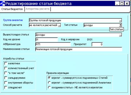 Окно справочника отображает структуру статей бюджетов корпорации в виде иерархического или линейного списка. Крайняя слева колонка предназначена для отображения признака помеченной записи. Далее для каждой статьи выводится полное и сокращенное наименование, код, валюта, единица измерения и группа аналитик, привязанная к данной статье. В колонке Агрегация (крайняя справа) для расчетной статьи указывается признак агрегации, который задается в окне = Редактирование статьи бюджета = с помощью группы кнопок-опций Правила агрегации: С — агрегат статей, А — агрегат аналитики, Н — не агрегат. В нижней панели окна для расчетной статьи отображается алгоритм расчета статьи, вариант бюджета и центр ответственности. Вид окна справочника приведен на рис. 6.