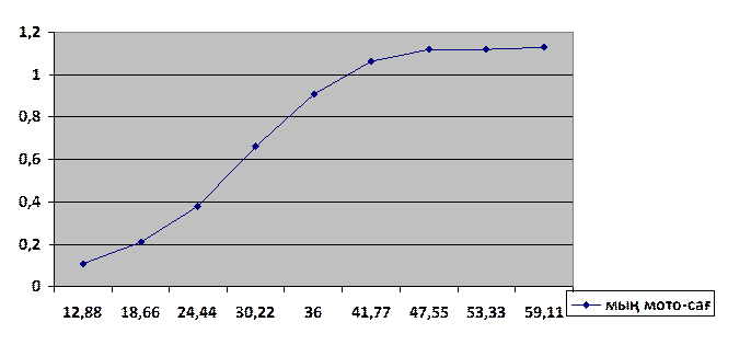 Жиынтық ты тә жірибелік ү лестірілудің графиктеріне жиынтық ты тә жірибелік ық тималдылық пен сенімділік кө рсеткішінің интегралдық ү лестірілуінің графиктері жатады. Жиынтық ты тә жірибелік ық тималдылық тың графигін тұ рғ ызу ү шін абсцисса ө сімен белгілі бір масштабпен сенімділік кө рсеткішінің (t) мә нін, ордината ө сімен жиынтық ты тә жірибелік ық тималдылық тың Осы нү ктелерді бір-бірімен тү зу сызық пен қ осқ ан кезде пайда болатын қ исық сызық ты график, жиынтық ты тә жірибелік ық тималдылық тың графигі деп аталады. Графиктің бірінші нү ктесі интервалдың басындағ ы санғ а сә йкес келетін абсциссаө сі бойындағ ы нү ктемен қ осылады. Тә жірибелік есептерді шығ ару ү шін сенімділік кө рсеткішінің гистограммасы мен полигон графиктеріне - Жиынтық ты тә жірибелік ық тималдылық тың графигі Тә жірибелік есептерді шығ ару ү шін сенімділік кө рсеткішінің гистограммасы мен полигон графиктеріне қ арағ анда жиынтық ты тә жірибелік ық тималдылық тың графигін тұ рғ ызу ың ғ айлы. Себебі гистограмма мен полигон графиктерінде кө рсеткіш интервалдарына сә йкес аудандарды анық тау қ ажет. Жиынтық ты тә жірибелік ық тималдылық тың графигінде аудандарды есептемей-ақ, анық талатын кө рсеткіштер ордината ө сінің бойынан тікелей анық талады. Мысалы, 32.3 мың мото-сағ ат ө ндірмеде жө ндеуді қ ажет ететін қ озғ алтқ ыштар санын анық тау керек. Ол ү шін тә жірибелік ық тималдылық жиынтығ ының графигін немесе сенімділік кө рсеткішінің (қ озғ алтқ ыш ресурсының) интегралдық ү лестірілуінің графигін пайдаланамыз. Графиктің абсцисса ө сінен 32.3 мың мото-сағ мә нін табамыз, осы нү ктеден тә жірибелік ық тималдылық жиынтығ ының қ исық сызығ ына дейін вертикаль тү зуін тү сіреміз. Қ иылысу нү ктесінен ордината ө сіне дейін горизонталь тү зуін сызып, оның ордината ө сімен қ иылысу нү ктесінің мә нін оқ имыз. График бойынша тә жірибелік ық тималдылық жиынтығ ының мә ні Σ рі=0, 47 Жө ндеуді қ ажет ететін қ озғ алтқ ыштардың нақ тылы саны: Nдв= 0, 47·70=33 дана. Мұ ндай графиктің кө мегімен ө ндірменің кез келген интервалында қ озғ алтқ ыштардың қ арсылық санын анық тауғ а болады.