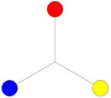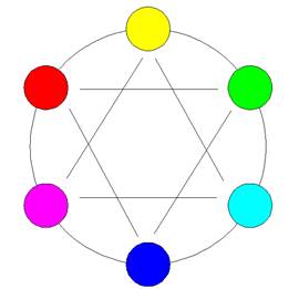 Смежные цвета неплохо совмещаются, однако выбор такого варианта обычно считается скучным и банальным. Цвета, которые находятся друг напротив друга, считаются мало совместимыми. Единственное исключение - синий неплохо смотрится в паре с желтым. Лучший выбор - цвета через один, те, которые на рисунке связаны прямыми линиями. Они отлично сочетаются в большинстве своих оттенков, главное, чтобы не было большого контраста в яркости. Важно также то, что черный и белый почти идеально сочетаются со всеми другими цветами, а в особенности друг с другом. Поэтому, если есть выбор, всегда проще сделать работу именно в этих цветах. Приведенный выше цветовой круг практически не используется практикующими дизайнерами. Они предпочитают использовать другой цветовой круг (его иногда называют дизайнерским, мы будем в дальнейшем вести речь только о нем, поэтому и называться он будет просто Цветовой круг), показывающий первичные, вторичные и третичные цвета. На цветовом круге есть три основных цвета (первичные) - это красный, желтый и синий, размещенные в виде равнобедренного треугольника. Эти цвета нельзя получить путем смешения других цветов, рисунок 31.