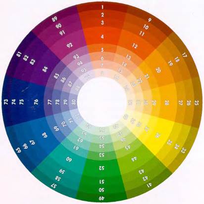 Все исходные цвета являются насыщенными цветами. Т.е. в них отсутствуют добавки оттенков серого цвета, начиная черным и заканчивая белым цветом. Добавление белого цвета нарастающими дозами вызывает появление оттенков, называемых тоном. Добавление черного цвета создает оттенки. Если проделать это по мере доведения каждого до белого и черного - получим полный цветовой круг. Обычно дизайнеры пользуются именно такими оттенками, а не насыщенными цветами - их добавляют лишь в качестве акцента и в небольших количествах. В традиционном дизайнерском цветовом круге (Цветовом спектре) присутствует 48 оттенков базовых цветов плюс 5 оттенков серого цвета, и 48 тонов плюс 5 тонов серого цвета, рисунок 34. Самым сложно насыщаемым цветом является желтый, а самыми насыщенными - синий и фиолетовый. Это следует помнить, колеровке интерьеров. Желтого колера потребуется очень много, прежде чем получится нужный оттенок. Напротив, с синим и фиолетовым очень легко переусердствовать.