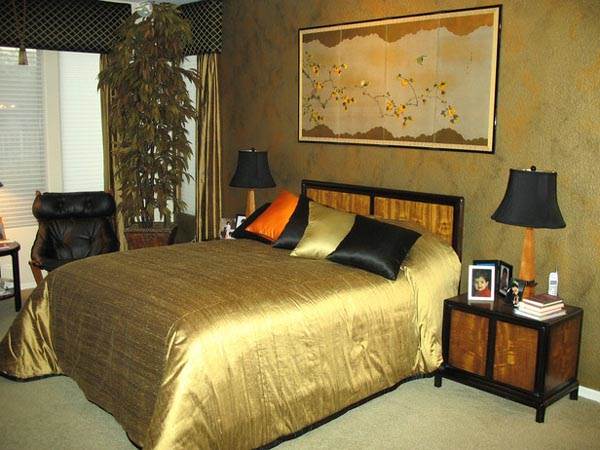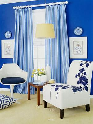 Прием № 9 - повторить цвет мебели в одном из оттенков обоев. Самый эффектный способ обратить внимание на яркую мебель - это расположить ее на фоне стены контрастного цвета. Но это было бы слишком просто, да и контрасты нравятся не всем, рисунок 45. Другой более эффектный вариант - обои, один из оттенков которых точно повторяет цвет мебели, рисунок 46. Лучше всего это работает, если мебель (ее обивка) - однотонная, рисунок. Дополнительная вариация на тему: однотонное покрывало на кровати, в изголовье которой - пестрые обои, опять-таки - один из оттенков обоев повторяет цвет покрывала. Но всегда помните, что истинные знания помогают длительное время, а правила созданы, чтобы их нарушать.