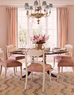 Прием № 3 - два цвета плюс разные рисунки. Предположим, что вы выбрали два цвета. Можно использовать их в разных деталях, но с помощью разнообразных рисунков: полоски, цветы, клетка и т.д. Плюс все это в разных масштабах (например, крупные и мелкие цветы или крупные цветы и мелкая полоска). Чтобы подобный интерьер не напрягал в дальнейшем своей ритмичностью, старайтесь, чтобы это сочетание дополнялось большим количеством светлых плоскостей. В идеале - оттенки белого, бежевого или серого, рисунок 39. Прием № 4 - три цвета плюс разные рисунки. В отличие от предыдущего приема, здесь нет сильного “ритма”, а есть необходимое разнообразие. Поэтому, хотя светлые тона и желательны, но их может быть гораздо меньше, чем в в предыдущем случае, рисунок 40. Прием в целом аналогичен предыдущему, но интереснее выглядит картина, где каждому рисунку отведен строго один участок (например, шторы или мягкая мебель), а на другом присутствуют те же цвета, но рисунок отличается. Еще больше разнообразия дает присутствие однотонных небольших предметов, повторяющих один из самых сочных оттенков.