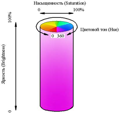 Рисунок 28 Значение цвета определяется как вектор, исходящий из центра круга (белый цвет). Точки по периметру окружности соответствуют чистым спектральным цветам (0 – 360о). Чистый красный цвет – 0о, зеленый 120о, синий – 240о. Длина вектора определяет насыщенность(0 – 100 %), направление – цветовой оттенок. На отдельной шкале (ахроматической) задается яркость (0 – 100 %). Модель HSB применяется при имитации приемов художников на компьютере. После создания изображения требуется перевод в другую цветовую модель. Основной недостаток модели – ограниченный цветовой охват, т.к. она использует то же цветовое пространство. Как и модель RGB.