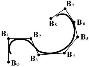 Термин NURBS, который является аббревиатурой (сокращением) и расшифровывается как Non-Uniform Rational B-spline, где: " Non-Uniform" (неоднородный) означает, что область влияния контрольной точки на форму кривой может быть различной. Это очень важное свойство для моделирования иррегулярных кривых. " Rational" (рациональный) означает, что математическое выражение, описывающее форму моделируемой кривой, есть отношение двух полиномов. Эта особенность позволяет точнее моделировать различные кривые, например конические сечения. " B-spline" (basis spline, базовый сплайн) - способ математического описания кривой интерполяцией между тремя и более контрольными точками. Заметим что, привычные для плоских векторных художников кривые Безье являются специальным (частным) случаем В-сплайна. Одной из основополагающих особенностей NURBS-кривой является то, что ее форма определяется расположением множества контрольных точек. Контрольные точки соединены для наглядности прямыми линиями. Эта ломаная линия получила название управляющего многоугольника (control polygon), рисунок 36. Каждая контрольная точка определяет форму только той части кривой, которая находится в ее окрестности, и оказывает меньшее воздействие или вовсе не влияет на форму оставшейся части кривой. Если веса всех контрольных точек положительны, кривая лежит в области, полученной соединением крайних (внешних) контрольных точек. Такой " габаритный" контейнер получил название " выпуклой оболочки" (convex hull). Основными объектами ВГ являются: примитивы (линия, круг, эллипс и др.), составные объекты и различные заливки. Примитив - объект создаваемый, редактируемый и уничтожаемый одной командой.