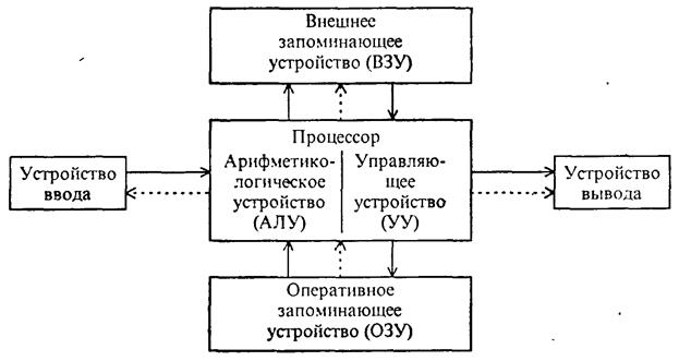 Архитектура ЭВМ, построенной на принципах фон Неймана. Сплошные линии со стрелками указывают направление потоков информации, пунктирные – управляющих сигналов от процессора к остальными узлам ЭВМ Фон Нейман не только выдвинул основополагающие принципы логического устройства ЭВМ, но и предложил ее структуру, которая воспроизводилась в течение первых двух поколений ЭВМ. Основными блоками по Нейману являются устройство управления (УУ) и арифметико-логическое устройство (АЛУ) (обычно объединяемые в центральный процессор), память, внешняя память, устройства ввода и вывода. Следует отметить, что внешняя память отличается от устройств ввода и вывода тем, что данные в нее заносятся в виде, удобном компьютеру, но недоступном для непосредственного восприятия человеком. Так, накопитель на магнитных дисках относится к внешней памяти, а клавиатура – устройство ввода, дисплей и печать – устройства вывода. Многопроцессорность — использование пары или большего количества физических процессоров в одной компьютерной системе. Термин также относится к способности системы поддержать больше чем один процессор и/или способность распределить задачи между ними.