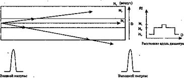 Рис. 3.20. Передача по одномодовому оптическому волокну Для того чтобы передача света по одномодовому волокну происходила описанным выше образом,, импульс света, вводимый в сердечник, должен быть очень точно нацелен по центру сердечника, иначе большая часть светового излучения будет потеряна в оболочке. Если система реализована правильно, импульс входного сигнала появится на выходе из волокна с почти той же формой. При передаче по волокну единственной основной моды в одномодовом волокне теоретически не может быть модовой дисперсии. Диаметр сердечника одномодового волокна находится обычно в пределах от 8 до 9 мкм. Типичная спецификация одномодового волокна составляет 8, 5/125/250 мкм.