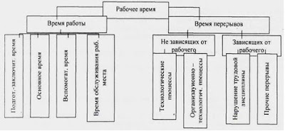 Подготовительно-заключительное временя - время, затрачиваемое на все действия исполнителя, связанные с подготовкой к данной работе, и ее окончанием. В это время входит подготовка рабочего места, наладка оборудования, установка инструмента и приспособления для обработки данной партии деталей, а также снятие инструмента и приспособления после ее окончания. К подготовительно-заключительному времени относится получение задания на работу и ознакомление с работой, изучение технологической документации. Длительность Тпз зависит от вида оборудования, характера работы и типа производства. Характерной особенностью подготовительно-заключительного времени является то, что оно затрачивается рабочим один раз для всего заданного объема работы (например изготовления партии деталей) и его продолжительность не зависит от объема работы. Основным (или технологическим) называют время, затрачиваемое непосредственно на выполнение той части технологической работы, которая изменяет предмет труда (его форму, состояние, свойство материала, внешний вид, размер и др.). Основное время определяется по нормативам или согласно специальному расчету, в основе которого лежит зависимость расхода основного времени на единицу продукции (изделия) от технологического режима работы оборудования. Вспомогательным временем называется время, затрачиваемое рабочим на действия, которые непосредственно не влияют на предмет труда, но эти действия необходимы для того, чтобы выполнялась основная работа (например, время на установку (снятие) детали на станке или ручное время на подвод и отвод инструмента). Временем обслуживания рабочего места (Тоб) называется время, затрачиваемое рабочим на уход за своим рабочим местом как на протяжении данной работы, так и всей смены. Оно включает в себя время технического обслуживания (Тобт), например, время на смену инструмента при затуплении или поломке, время на подналадку оборудования и другие действия, связанные с конкретной работой, время организационного обслуживания (Тобо), например, время на раскладку и уборку инструмента в начале и в конце смены, время на смазку и чистку оборудования и другие действия, связанные с уходом за рабочим местом на протяжении смены. Время обслуживания рабочего места определяется по формуле: