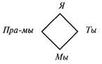 Рис. 2. Схема базового конфликта: Я – отношение близких' родителей, братьев, сестер к клиенту; Ты – отношения родителей между собой, Мы – отношение родителей к окружающему миру, друзьям; Пра-мы – отношение родителей к будущему, их мировоззрение и т.д. Например, рассматривая сферу Я, клиент анализирует взаимоотношения с родителями, братьями и сестрами: как они относились к нему, какой опыт общения приобрел он, отмечает слабые и сильные стороны. Этот самоанализ, безусловно, делается под «руководством» практического психолога. Такую работу можно провести и в отношении партнера. Анализ сферы Мы позволяет выявить, откуда у клиента те или другие модели поведения, а при анализе сферы Мы партнера – какие модели поведения будет предъявлять он в своей семейной жизни. Поняв эти и другие сферы переработки конфликта клиента и ею партнера, можно объяснить трудности взаимоотношения в настоящем и спрогнозировать будущее. Другой метод, предложенный Н.Пезешкианом, связан с анализом так называемых актуальных способностей. Клиенту предлагается заполнить «Дифференциально-аналитический опросник» («ДАО»). Дифференциально-аналитический опросник