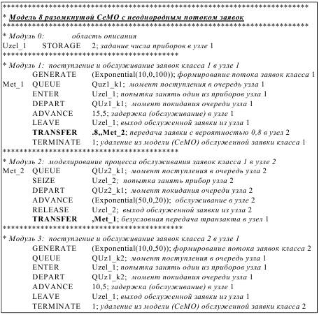 Длительности обслуживания заявок класса 1 и 2 в двухканальном узле 1 представляют собой равномерно распределённые случайные величины в интервалах (15±5) и (10 ±5) секунд соответственно. Длительность обслуживания заявок класса 2 в одноканальном узле 2 – величина случайная, распределенная по экспоненциальному закону со средним значением 20 секунд. Краткое описание рассматриваемой СеМО: • количество потоков (классов) заявок: H = 2; • количество узлов в сети: n = 2; • количество обслуживающих приборов в узле 1: K1 = 2; • количество обслуживающих приборов в узле 2: K2 =1; • емкость накопителей в узлах сети – не ограничена, то есть в сети не может быть потерь заявок, что обусловливает линейность сети; • потоки заявок класса 1 и класса 2 – простейшие; • средний интервал между поступающими заявками класса 1: a0(1)= 100c; • средний интервал между поступающими заявками класса 2: a0(2)= 50c; • длительность обслуживания заявок класса 1 в узле 1 распределена равномерно в интервале от 10 до 20 с: b1(1) =15 ± 5 c; • длительность обслуживания заявок класса 2 в узле 1 распределена равномерно в интервале от 5 до 15 с: b1(2) =10 ± 5 c; • длительность обслуживания заявок класса 1 в узле 2 распределена по экспоненциальному закону со средним значением 20 с: b2(1)= 20c. Текст GPSS-модели разомкнутой СеМО с неоднородным потоком заявок представлен на следующей странице. В рассматриваемой GPSS-модели, в отличие от модели 5 двухузловой РСеМО с однородным потоком заявок, появился третий модуль, моделирующий процессы поступления и обслуживания заявок класса 2 в узле 1. Таким образом, при моделировании СеМО с неоднородным потоком заявок количество исполняемых модулей GPSS-модели определяется как произведение количества классов заявок на количество узлов моделируемой СеМО. Анализ представленного отчета позволяет получить основные характеристики функционирования разомкнутой СеМО с неоднородным потоком заявок (наиболее интересные и важные результаты моделирования выделены жирным шрифтом).