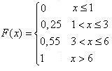 Найти функцию распределения F (x) и построить ее график. Решение: Найдем функцию распределения F (x). 1. Если x ≤ 1, то F (x) = 0. Действительно, значений меньших числа 1, величина Х не принимает. Следовательно, при x ≤ 1 функция F (x) = P (X < x) = 0. 2. Если 1 < x ≤ 3, то F (x)= 0, 2. Действительно, Х может принять значение 1 с вероятностью 0, 25. 3. Если 3 < x ≤ 6, то F (x) = 0, 55. Действительно, Х может принять значение 1 с вероятностью 0, 25 и значение 3 с вероятностью 0, 3. Следовательно, одно из этих значений Х может принять (по теореме сложения вероятностей несовместных событий) с вероятностью 0, 25 + 0, 3 = 0, 55. 4. Если x > 6, то F (x) = 1. Действительно, событие x > 6 достоверное и вероятность его равна 1. Искомая функция распределения имеет вид: . График этой функции приведен на рис. 1.1.