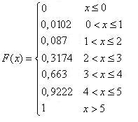 Функцию распределения F (х) находим по формуле (1.15) как функцию накопленных вероятностей , где суммирование распространяется на все значения индекса i, для которых xi < x. Полученные значения функции распределения записаны в последнем столбце таблицы 1.3. Искомая функция распределения имеет вид: График функции распределения представлен на рис. 1.2. Ответ: M (X) = 1, 624; D (X) ≈ 0, 81; σ ≈ 0, 9; P (X) = 0, 16.